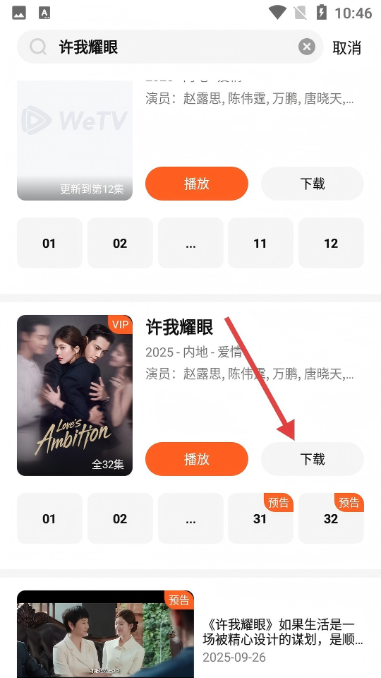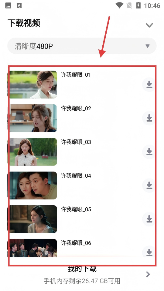 4、在下载视频界面选择要下载的集数,点击下载按钮,完成电视剧下载操作。