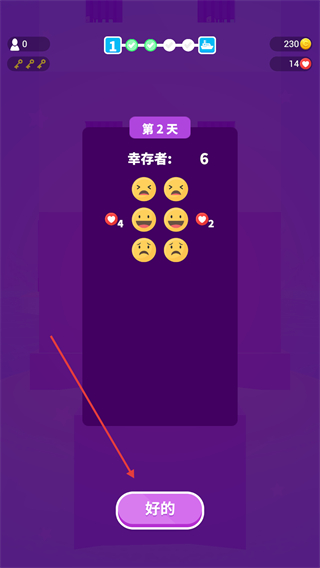 3、每天结束后,查看幸存者数量(如第2天幸存者6人),点击【好的】进入下一天。