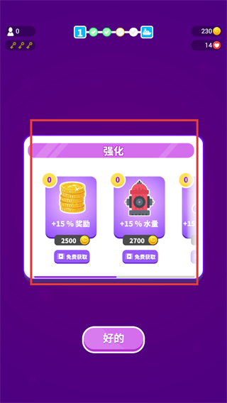 4、利用积累的资源进行强化,如选择金币奖励强化(+15%奖励)或水量强化(+15%水量)。