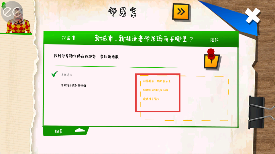 4、根据提示完成寻找棒棒糖、解救玛丽等步骤,推进邻居案的任务进程。