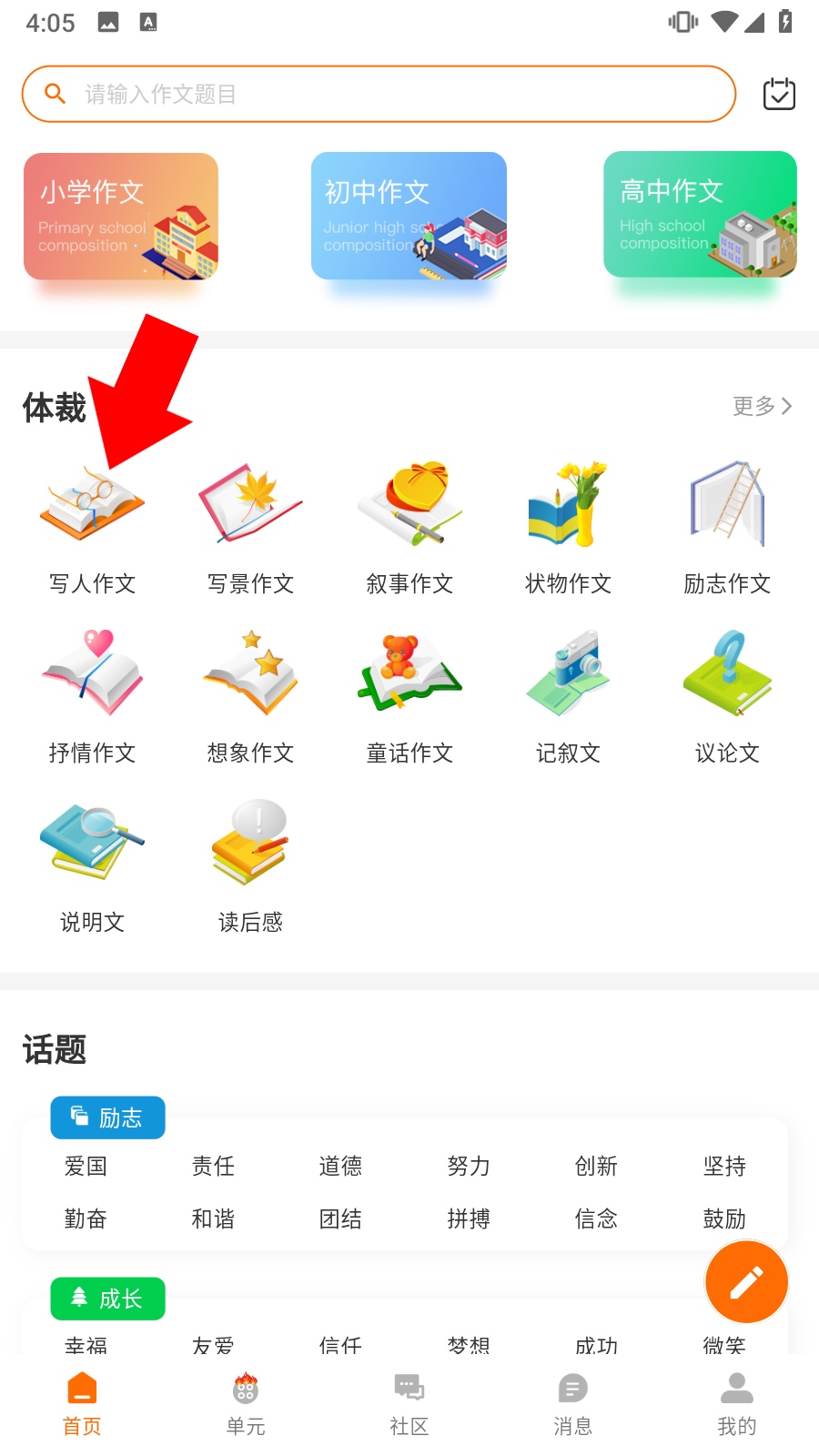 1、打开作文吧,在首页【体裁】栏点击【写人作文】。
