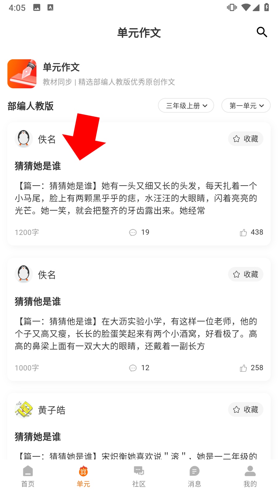 2、进入【单元作文】页面,选择感兴趣的作文题目如【猜猜她是谁】,点击查看作文内容。