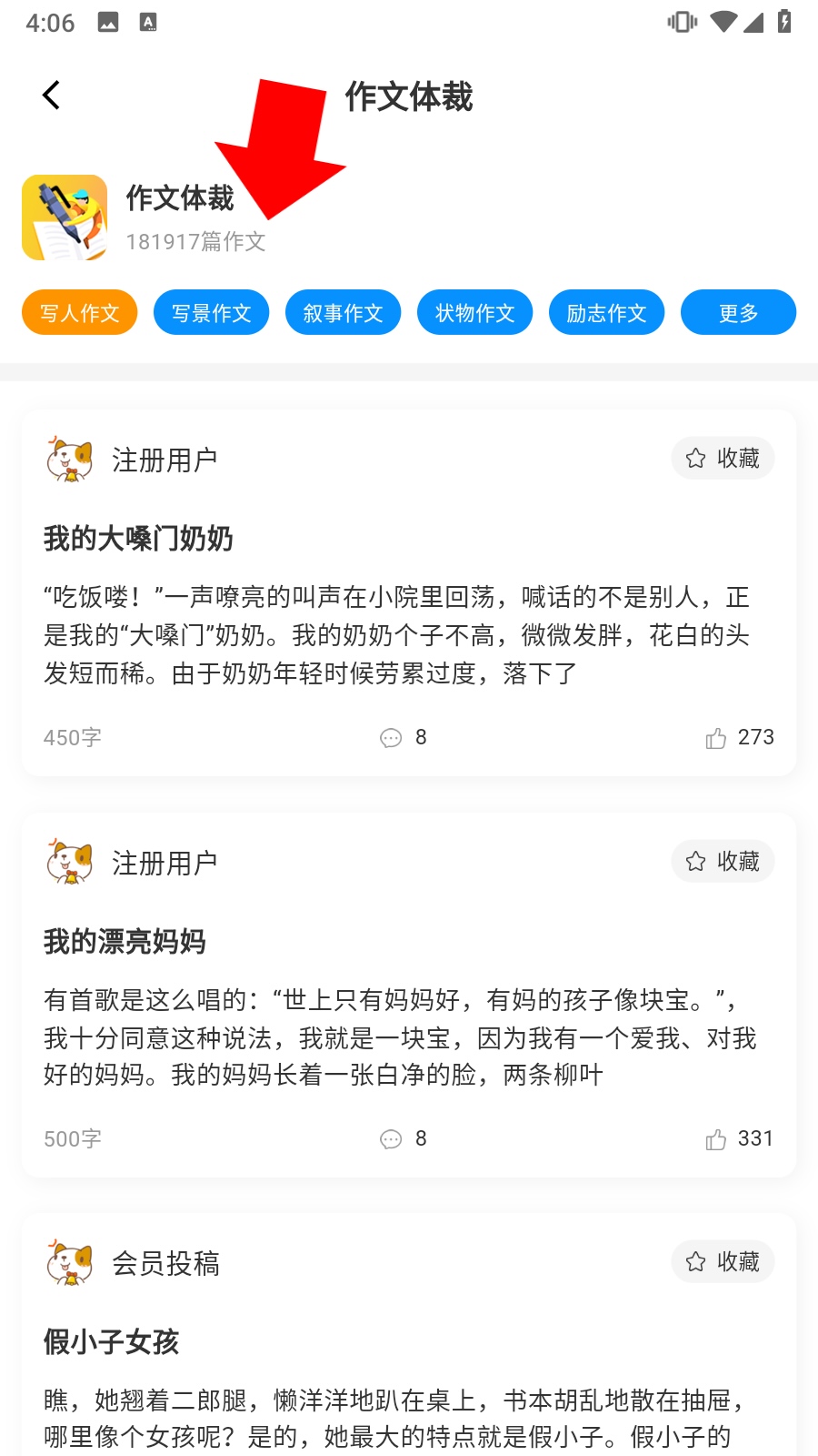 3、在【作文体裁】页面,可浏览不同用户投稿的写人作文,学习写作思路和技巧。
