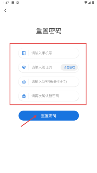 3、点【忘记密码】填手机、验证码,设新密码点【重置密码】。