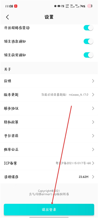 3、在设置界面滑动至底部位置,找到退出登录按钮并点击该按钮。