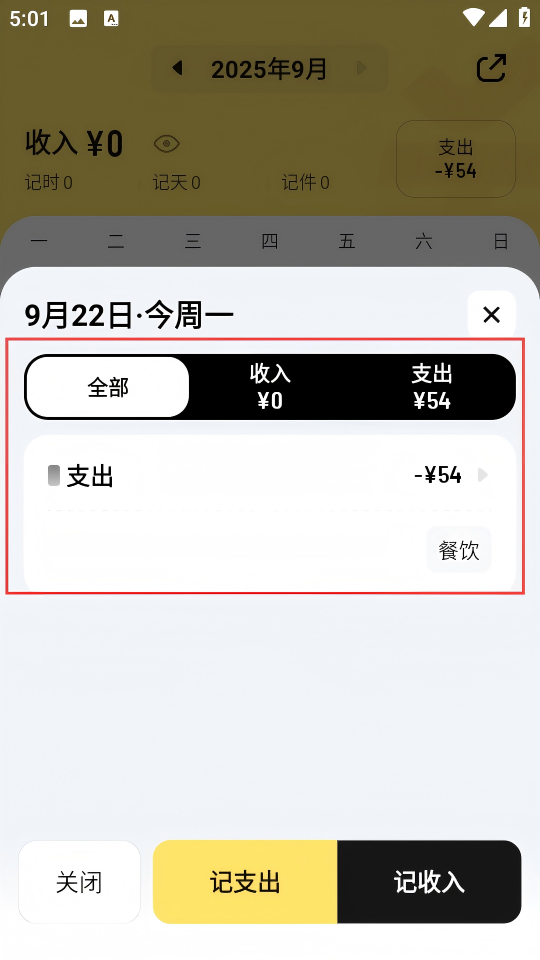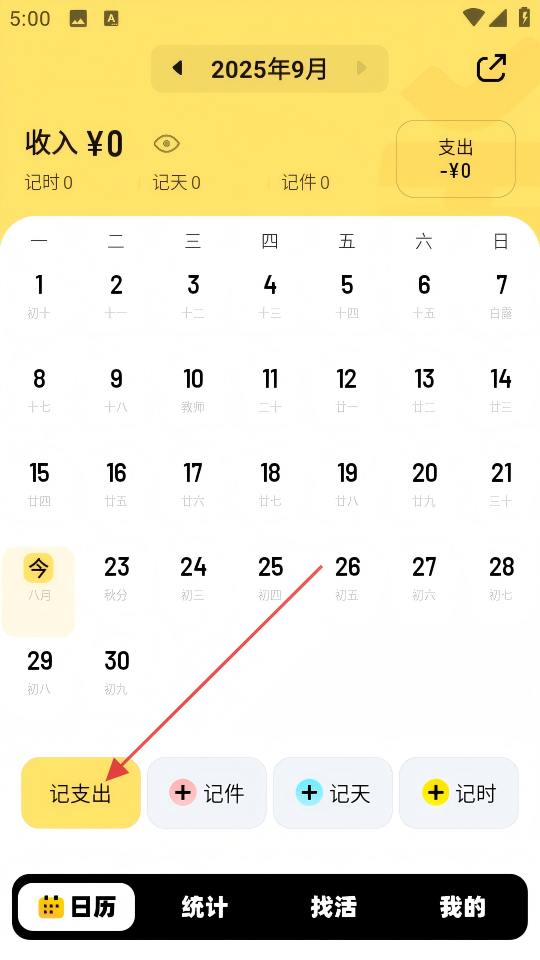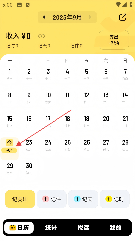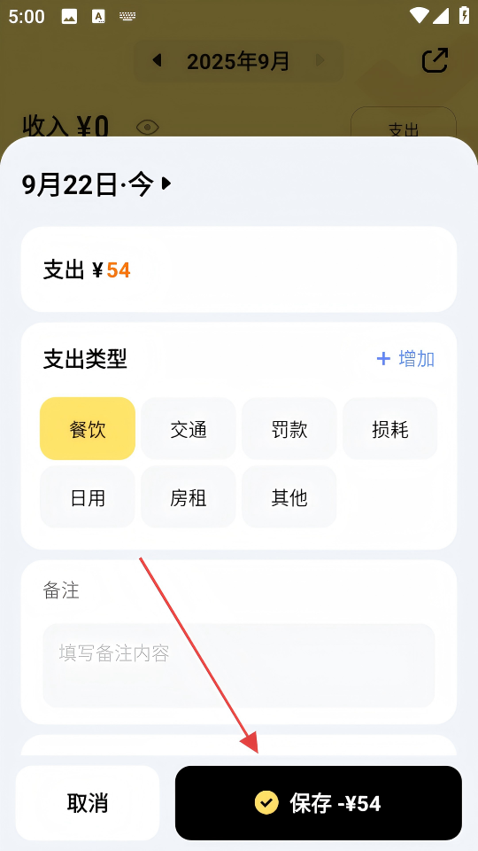 2、在支出记录页面,填写支出金额,选择支出类型,点击【保存】。