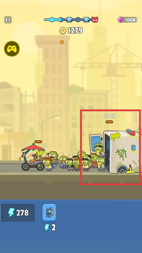 3、借助内置菜单强化的战车,持续攻击大量丧尸,快速积累金币和闪电,进一步提升战力。