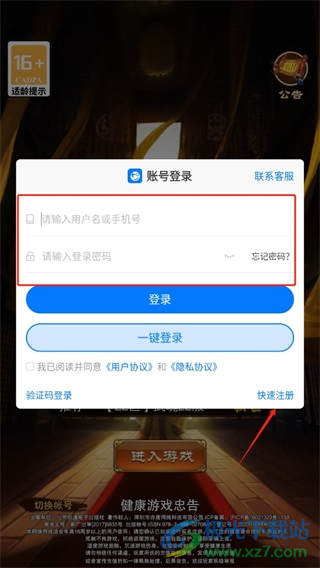 4、随后即可登录账号并进入游戏,如果还没有账号可以点击右下角的快速注册进行注册。