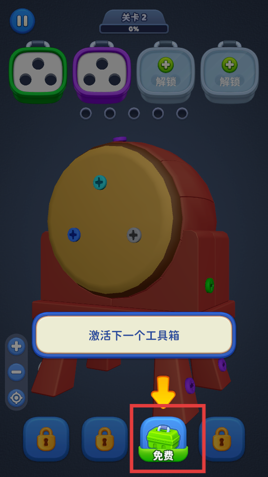 4、进入关卡2,点击下方“免费”的绿色工具箱,激活下一个工具箱,继续操作。