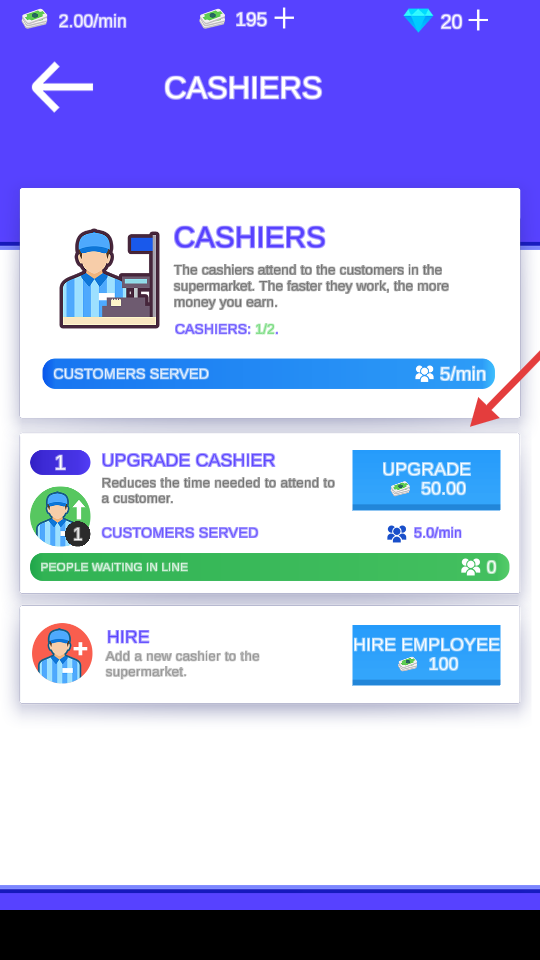 2、在“CASHIERS”界面,花费50钞票升级收银员,减少服务顾客的时间。