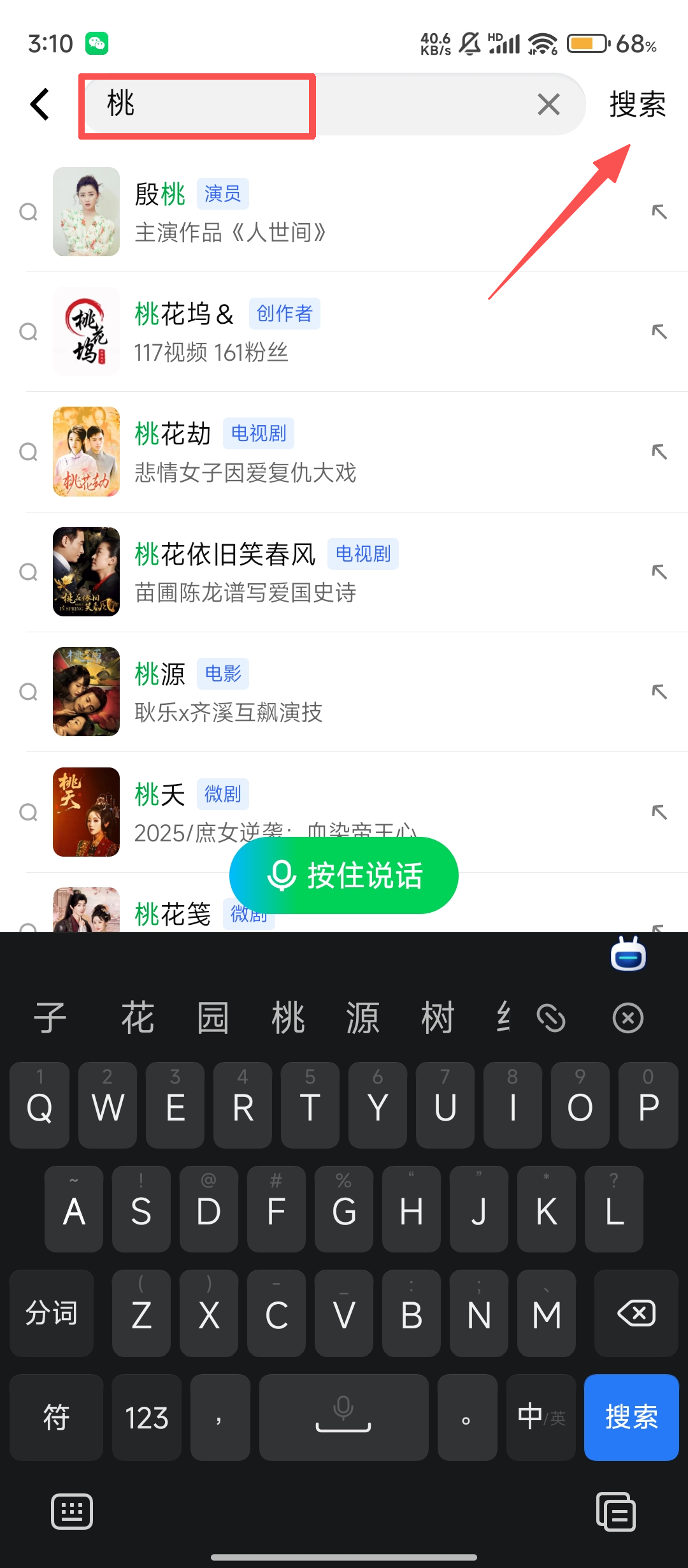 2、我们在搜索栏输入关键词,比如【桃】,然后点击右侧【搜索】按钮,就能获取相关搜索结果啦。