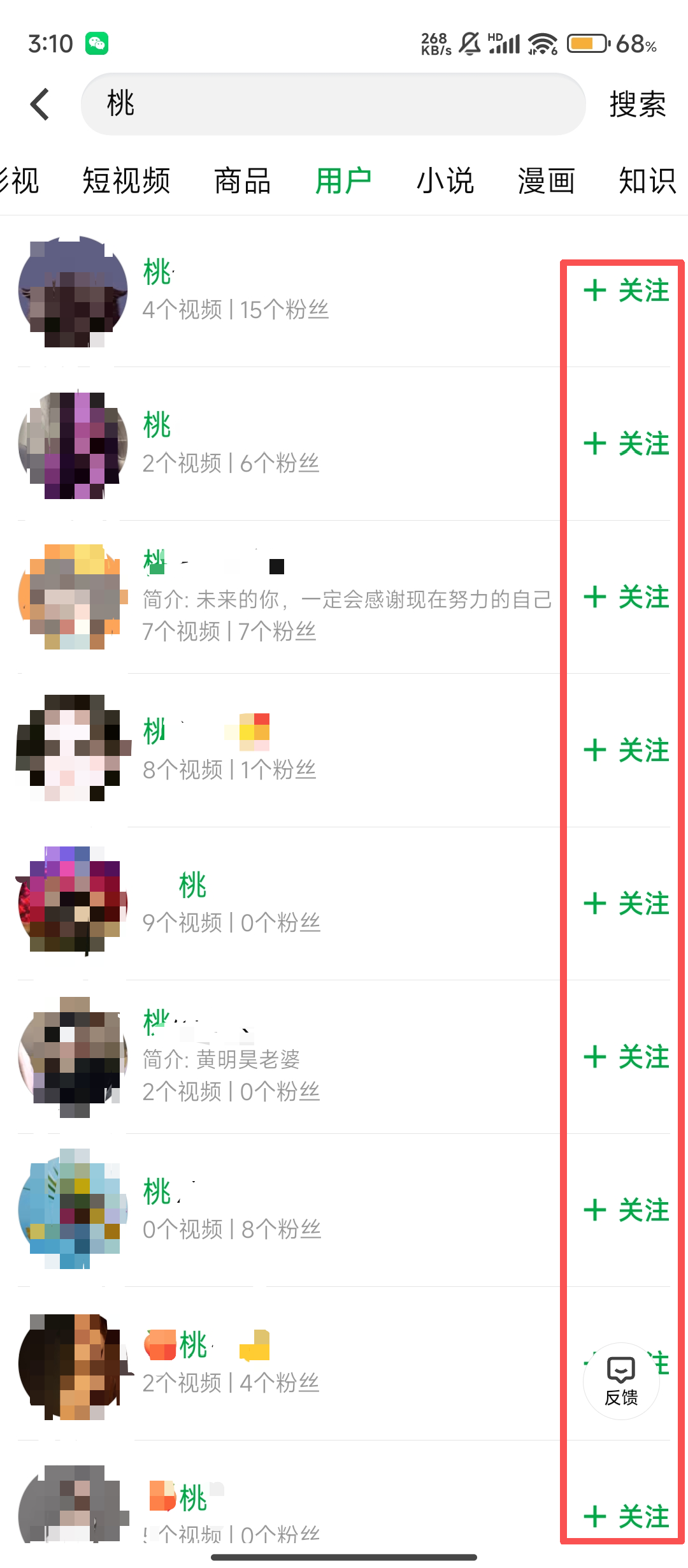4、在用户列表中,找到心仪用户后点击右侧【+关注】,就能关注该用户,方便后续查看其动态啦。