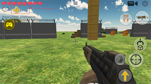 1、进入对局后,可通过左侧【+】按钮打开道具菜单,右侧的武器、投掷物按钮可触发对应操作,同时关注左上角的生命。