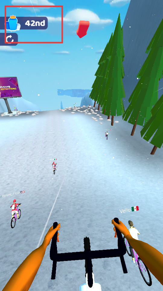 3、比赛中跟随红色箭头指引,在雪地场景超越前方选手,推进竞赛进程。