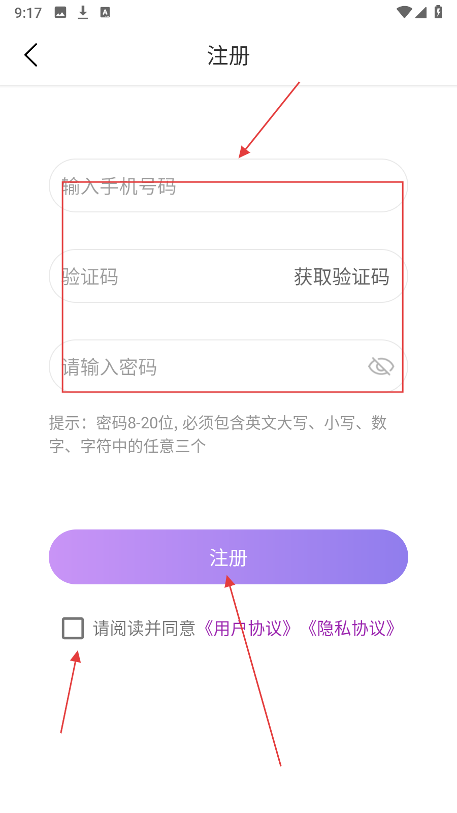 3、在注册页面输入【手机号码、验证码和密码】,勾选【同意协议】。