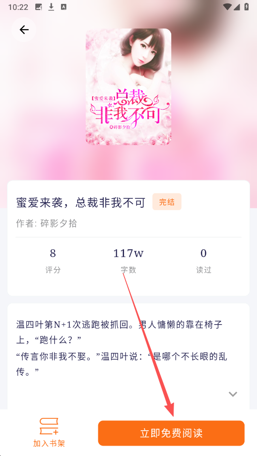 3、进入小说详情页,点击【立即免费阅读】,进入阅读界面。