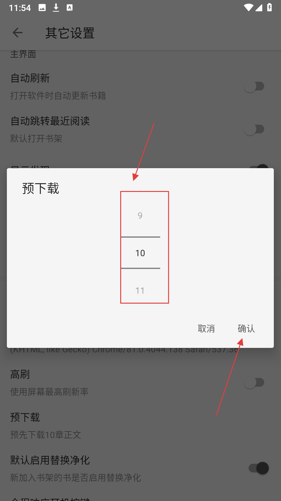 4、在弹出的预下载设置窗口,选择【预下载章节数】后点击【确认】,即可完成预下载设置。