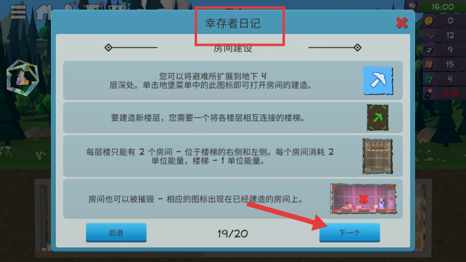 2、在【幸存者日记】中,点击【下一个】,了解房间建设规则。