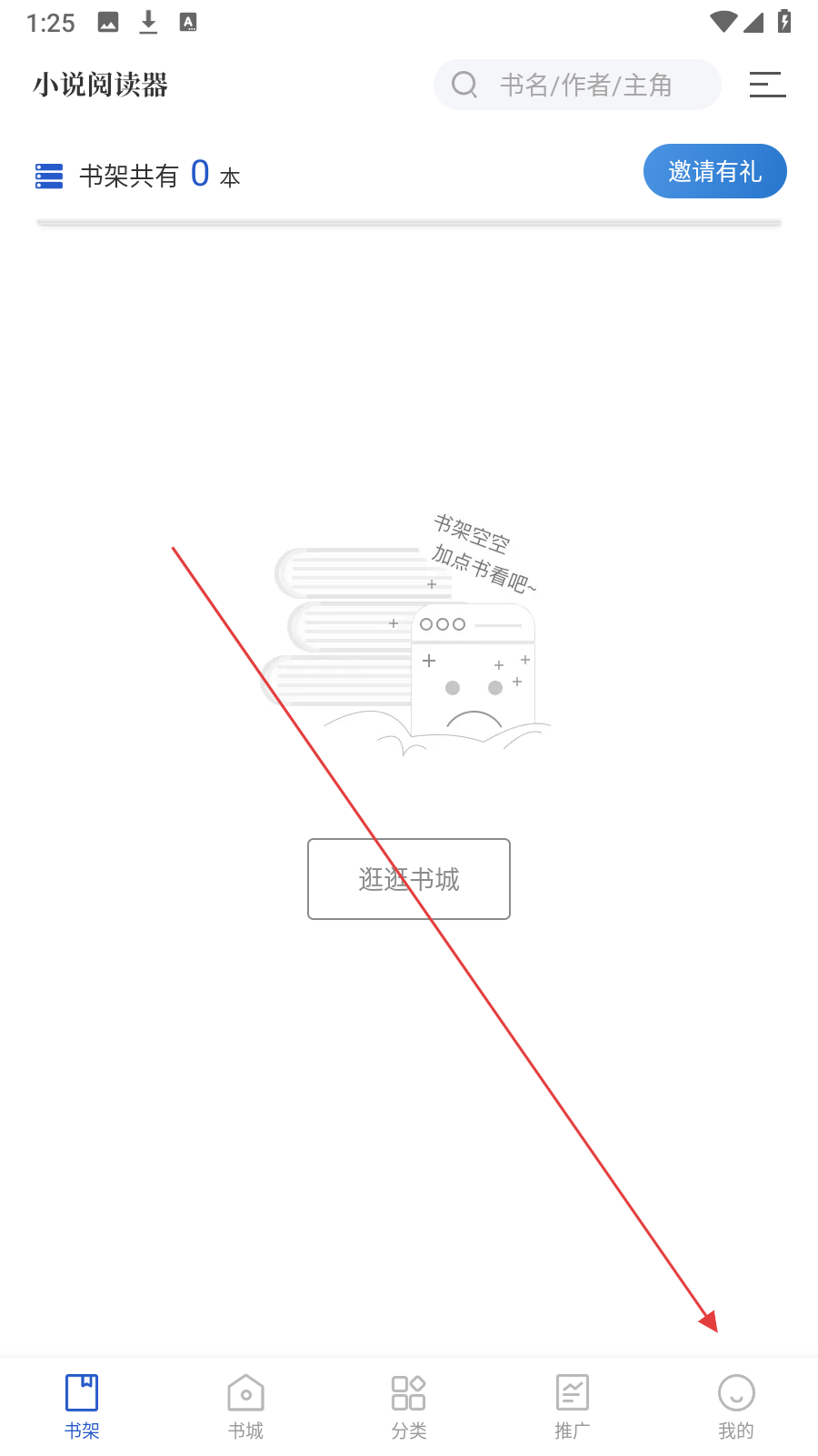1、在书架页面,点击右下角【我的】,进入个人页面。