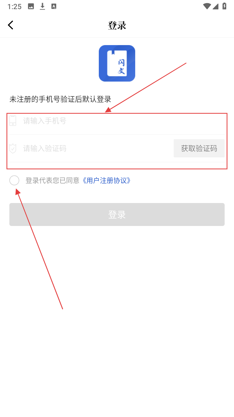 3、在登录页面,输入【手机号和验证码,勾选同意协议】。