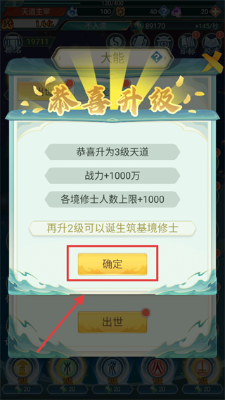 1、升级后点击【确定】关闭提示,查看战力增加1000万、修士上限增加1000的增益,了解再升2级可诞生筑基境修士的目标。