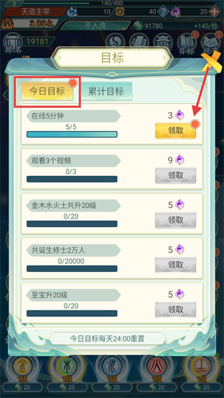 3、进入【今日目标】界面,完成【在线5分钟】任务后点击【领取】,获取【3】仙玉奖励,可用于后续升级或购买道具。