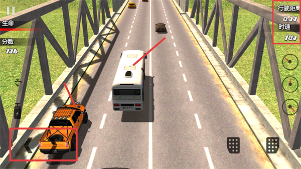 4、躲避其他车辆,保持行驶,增加行驶距离和分数。