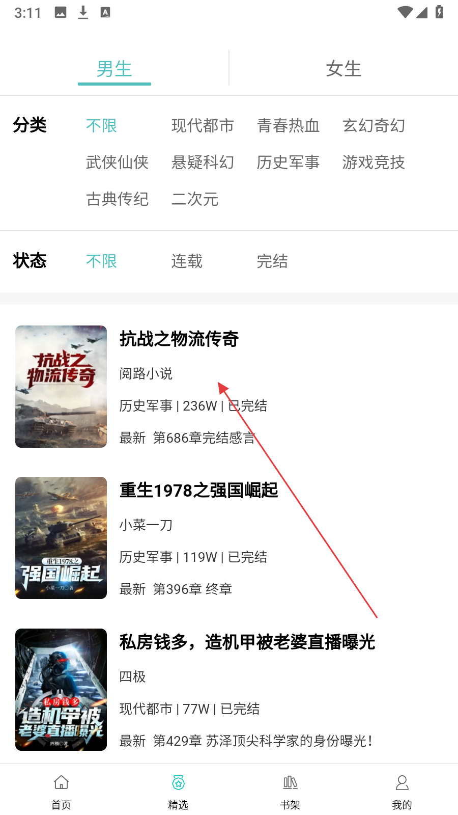 2、在精选页面,挑选【目标小说】,进入小说详情页。