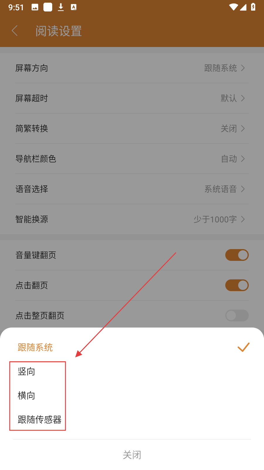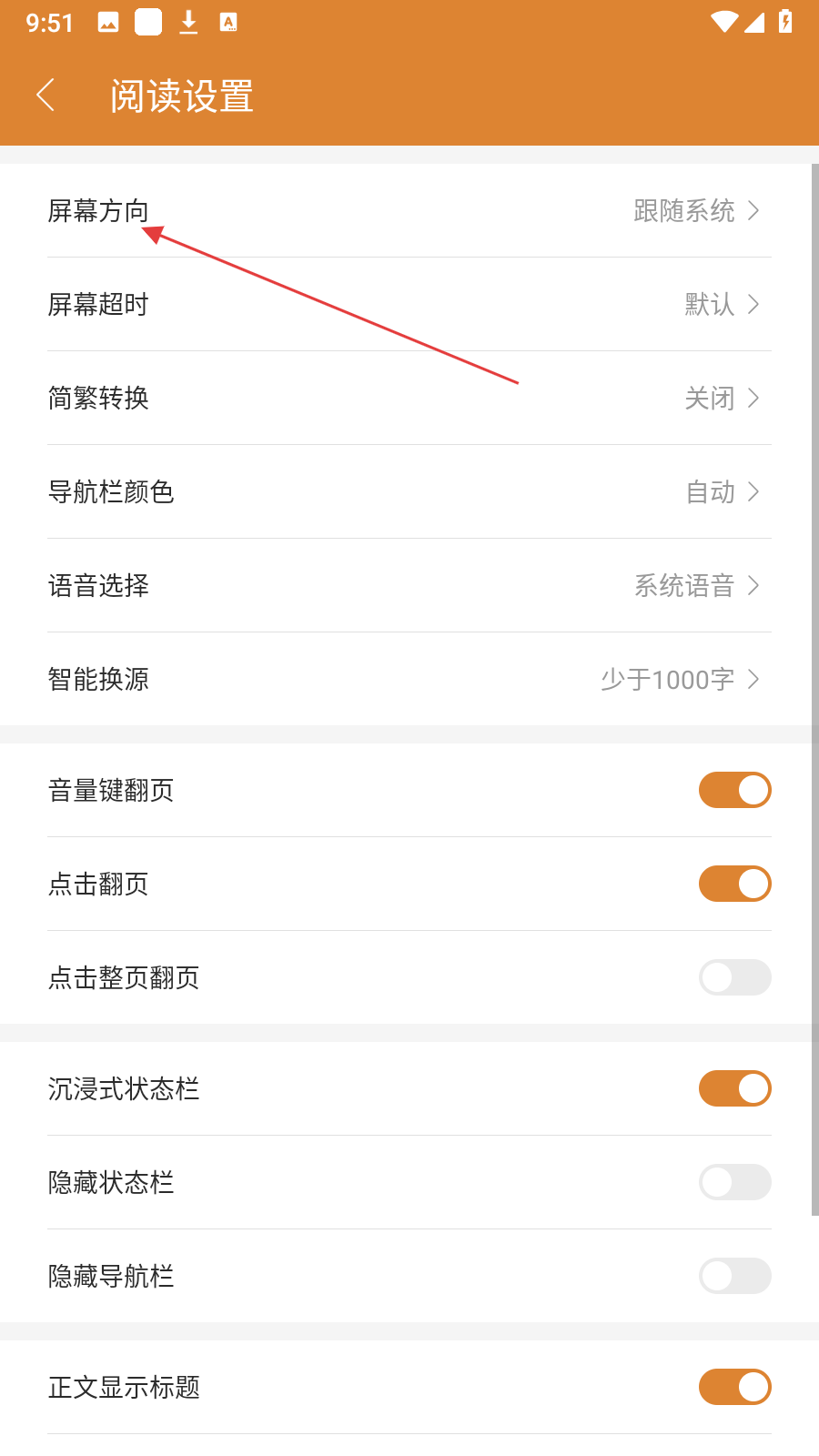 3、在阅读设置页面,点击【屏幕方向】,弹出屏幕方向选择弹窗。
