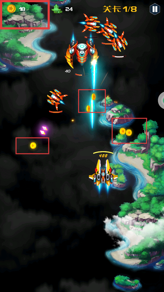 2、应对多架【敌机】时,优先收集地图中的【金币】,保持火力输出快速消灭敌人推进关卡。