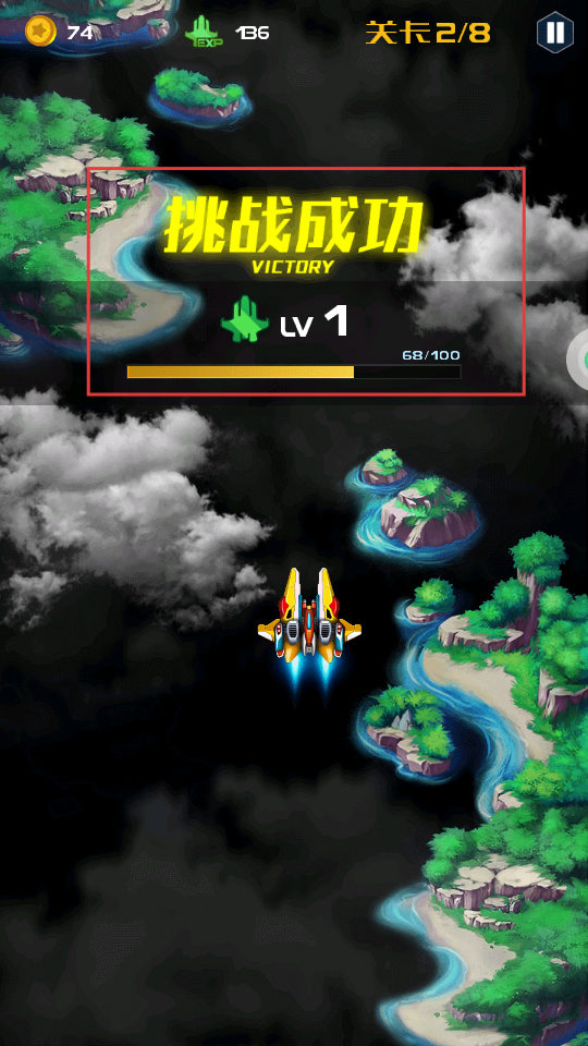 3、关卡挑战成功后,获得【经验】提升战机等级,当前【lv-1】进度为【68/100】继续累积。