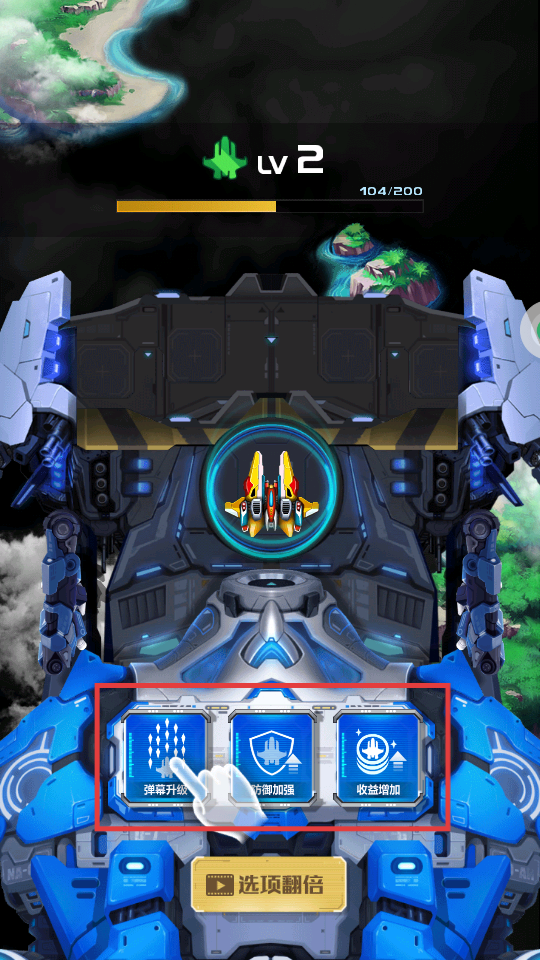 4、战机升级到【lv-2】后,从【弹幕升级】【防御加强】【收益增加】中选技能强化战力。