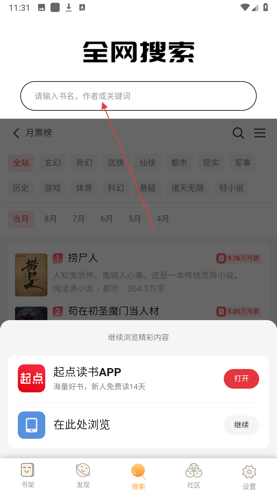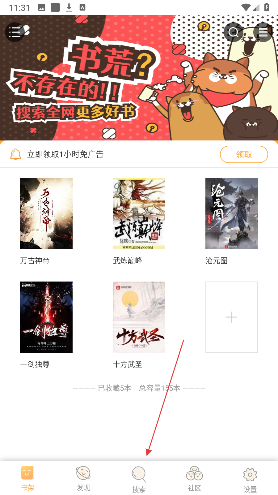 1、在书架页面,点击底部【搜索】,进入全网搜索页面。