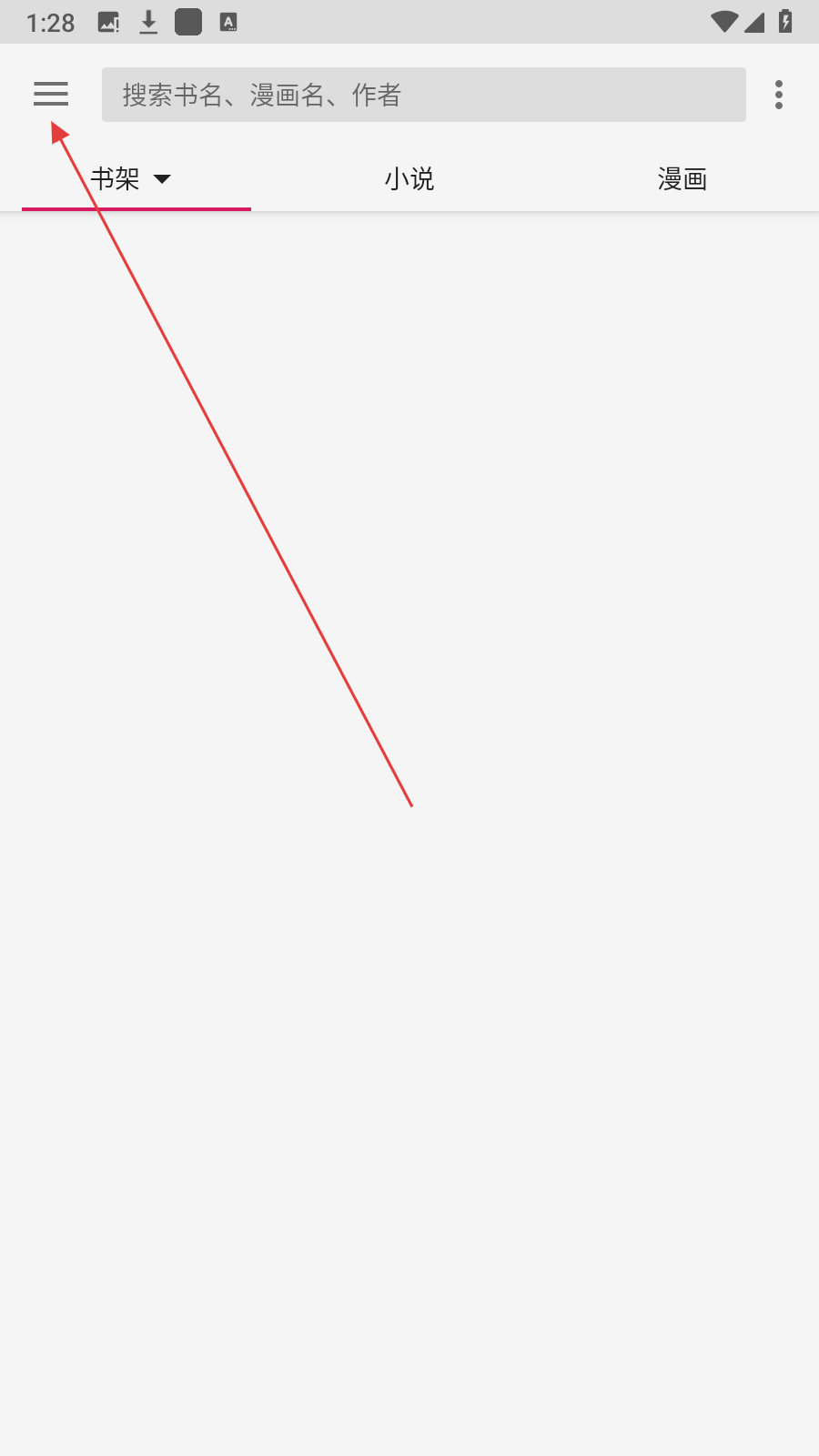 1、在书架页面,点击左上角【三条横线】图标,展开功能菜单。