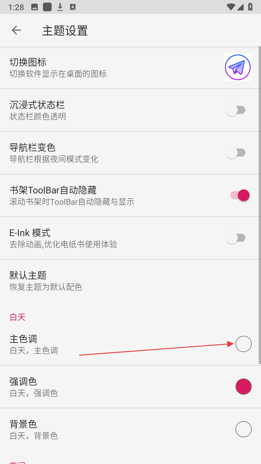 3、在主题设置页面,点击【主色调】,弹出颜色选择面板。