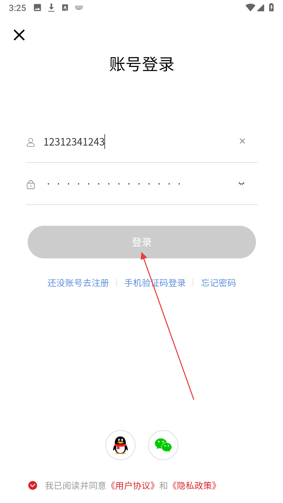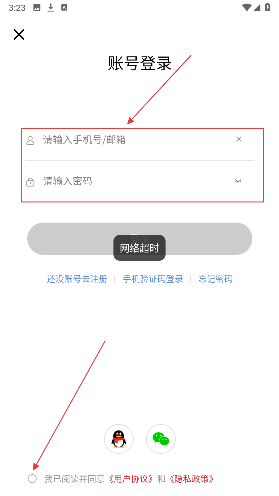 3、在账号登录页面,输入【手机号/邮箱和密码】,勾选【协议】。