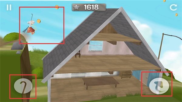 2、操控角色飞行时,用【钩子】调整方向收集空中金币,避开房屋障碍,保持移动节奏避免掉落。