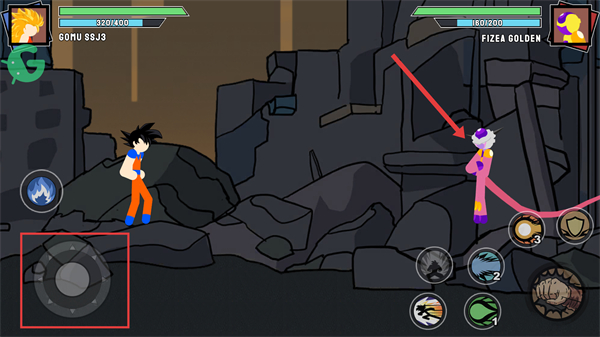 1、战斗中通过左侧方向键控制角色移动,靠近敌人(如FIZEA-GOLDEN)准备发起攻击。