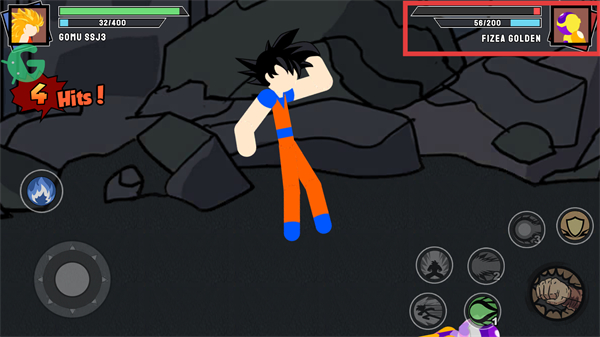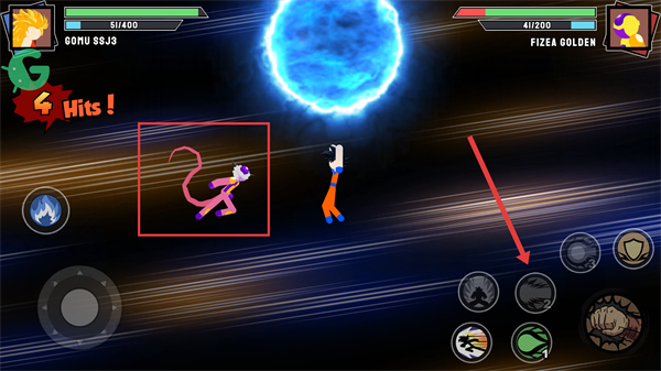 2、利用右侧技能按钮释放强力招式(如蓝色能量球技能),攻击红色框内的敌人,造成大量伤害。