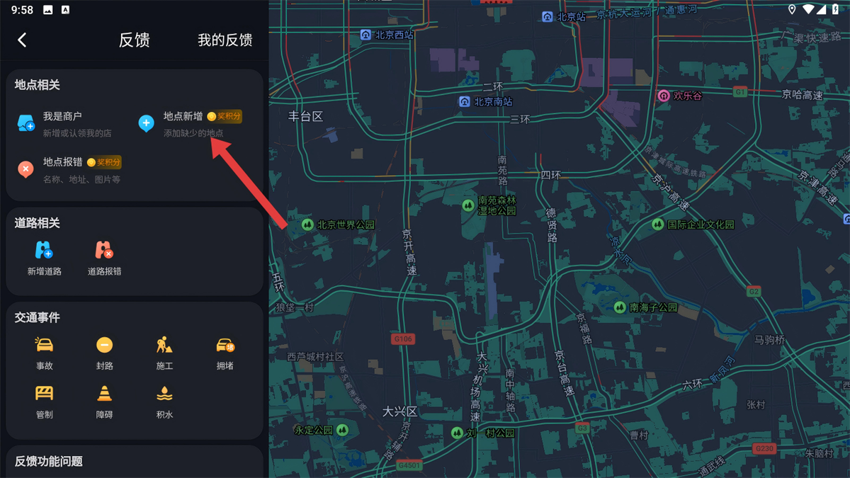 3、进入反馈界面后,找到【地点新增】选项,点击它就能添加缺少的地点,还能赢取积分哦。