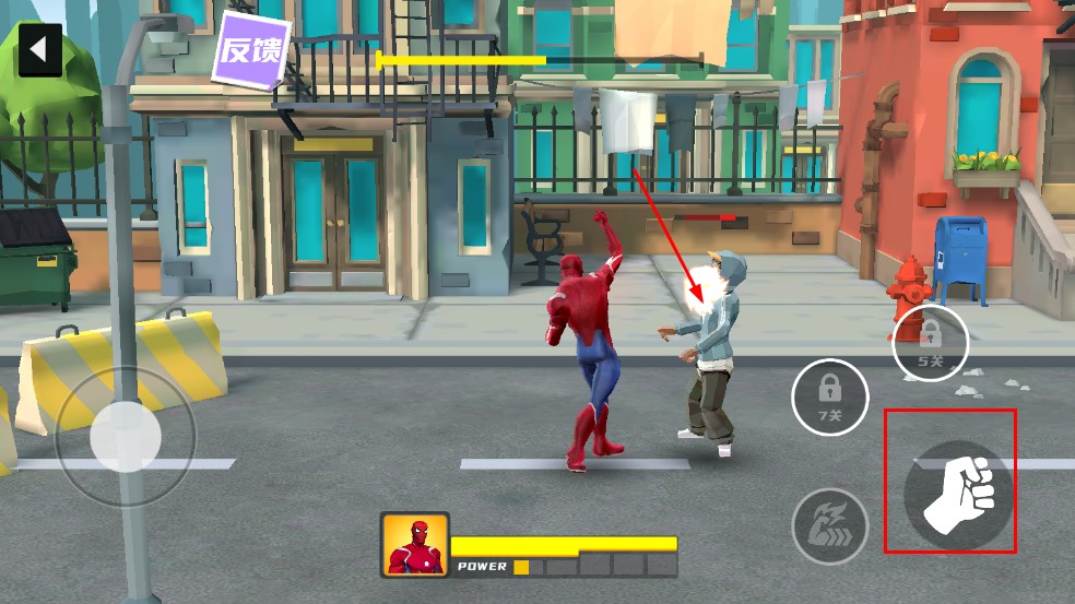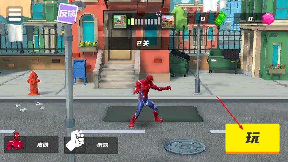 1、点击“玩”按钮,进入游戏,操控蜘蛛侠开启街头战斗。
