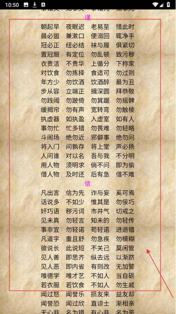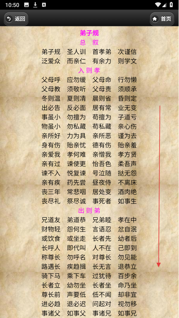 3、进入文章阅读页面后,查看总叙、入则孝等内容然后,继续【向下滑动屏幕】。