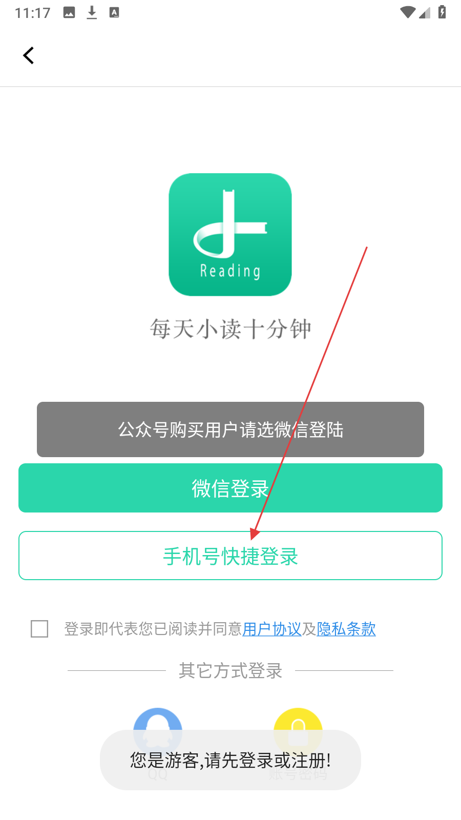 3、在登录选择页面,点击【手机号快捷登录】,进入手机号登录页面。