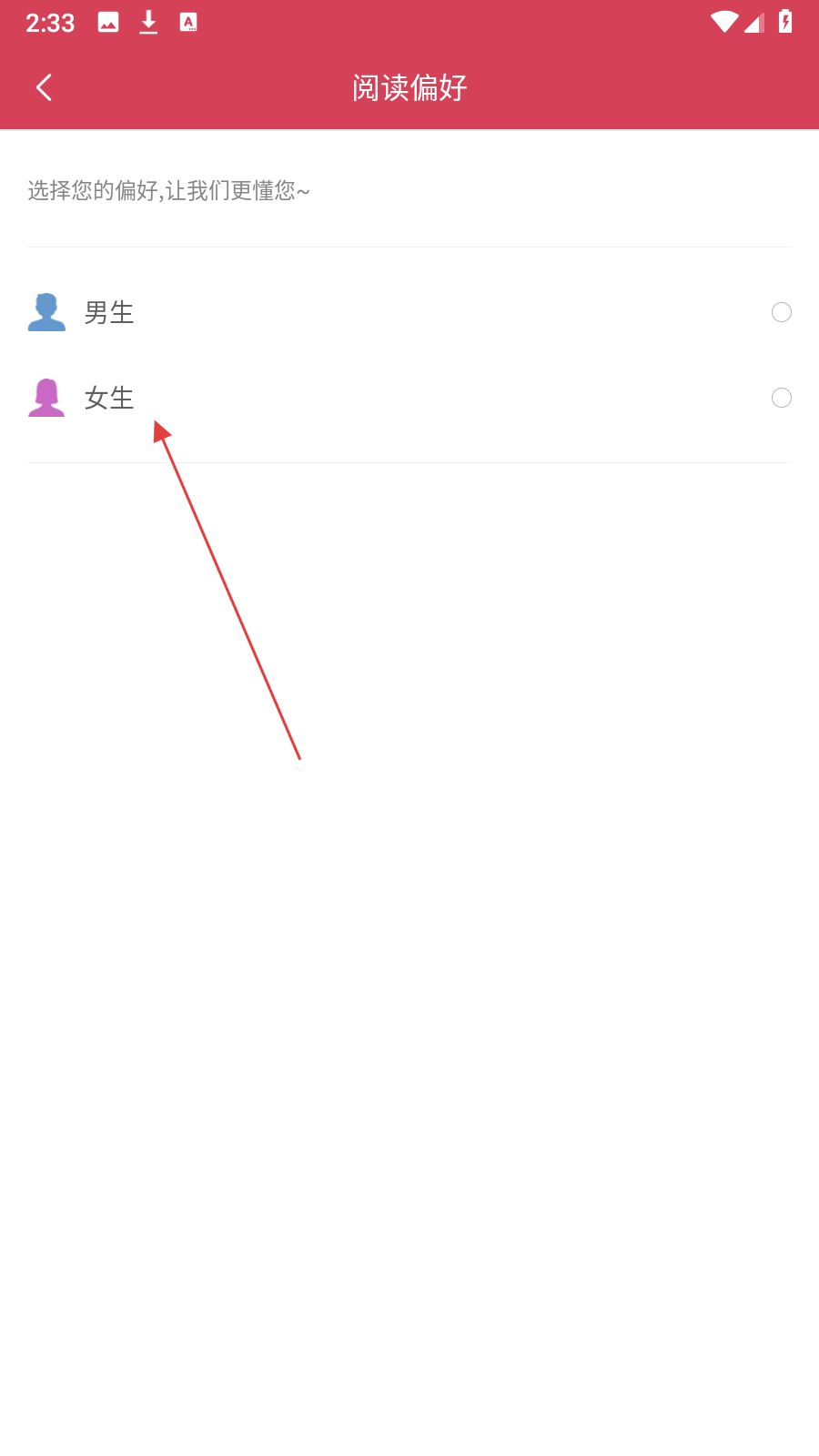 4、在阅读偏好设置页面,即可选择【男生】或【女生】偏好,完成阅读偏好设置。
