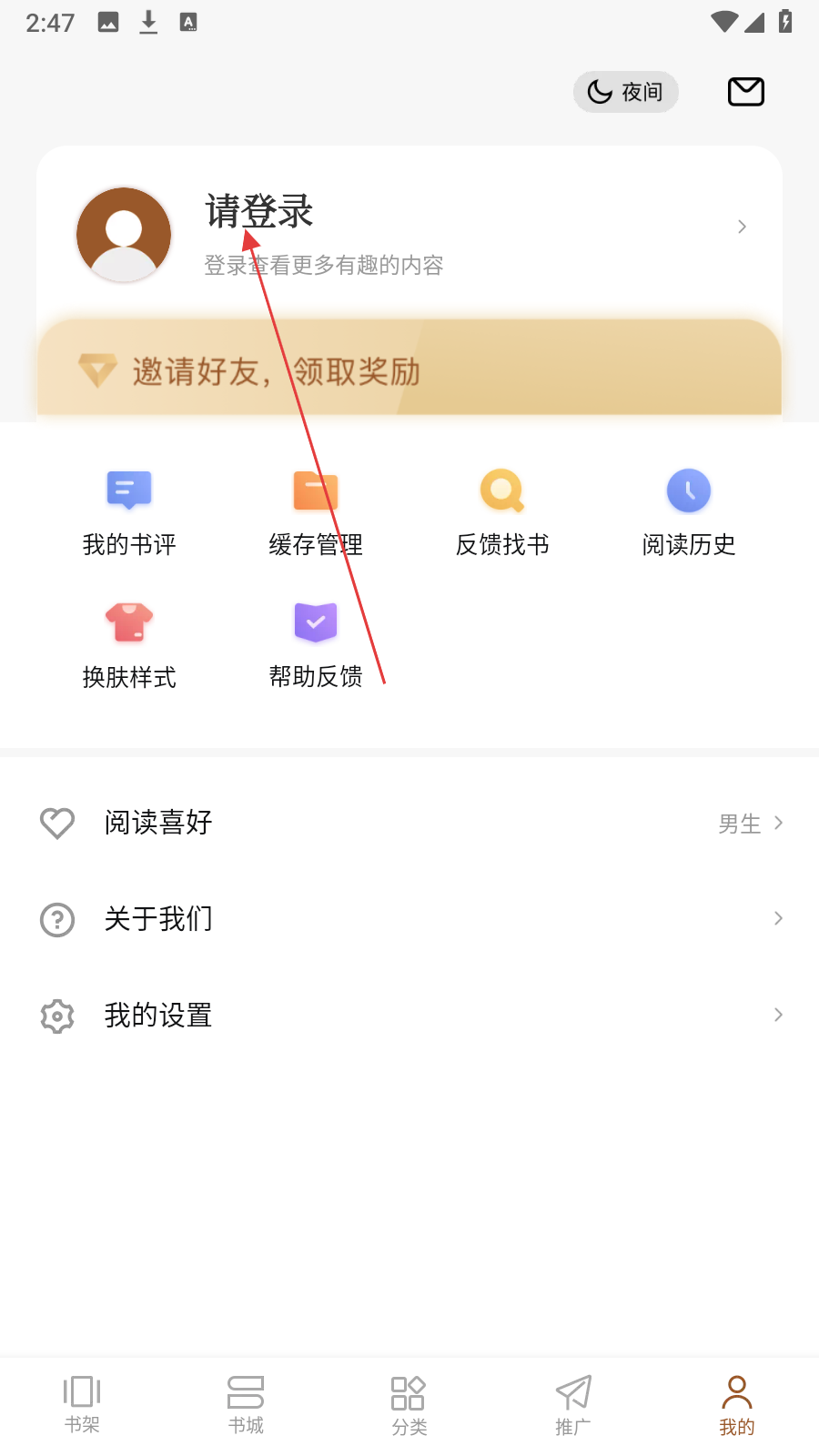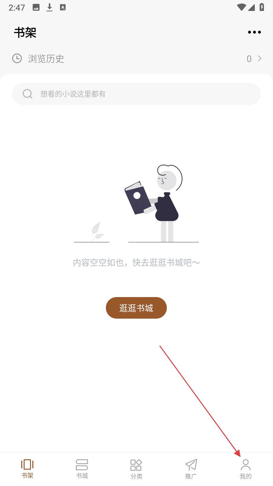 1、在书架页面,点击底部【我的】,进入个人页面。