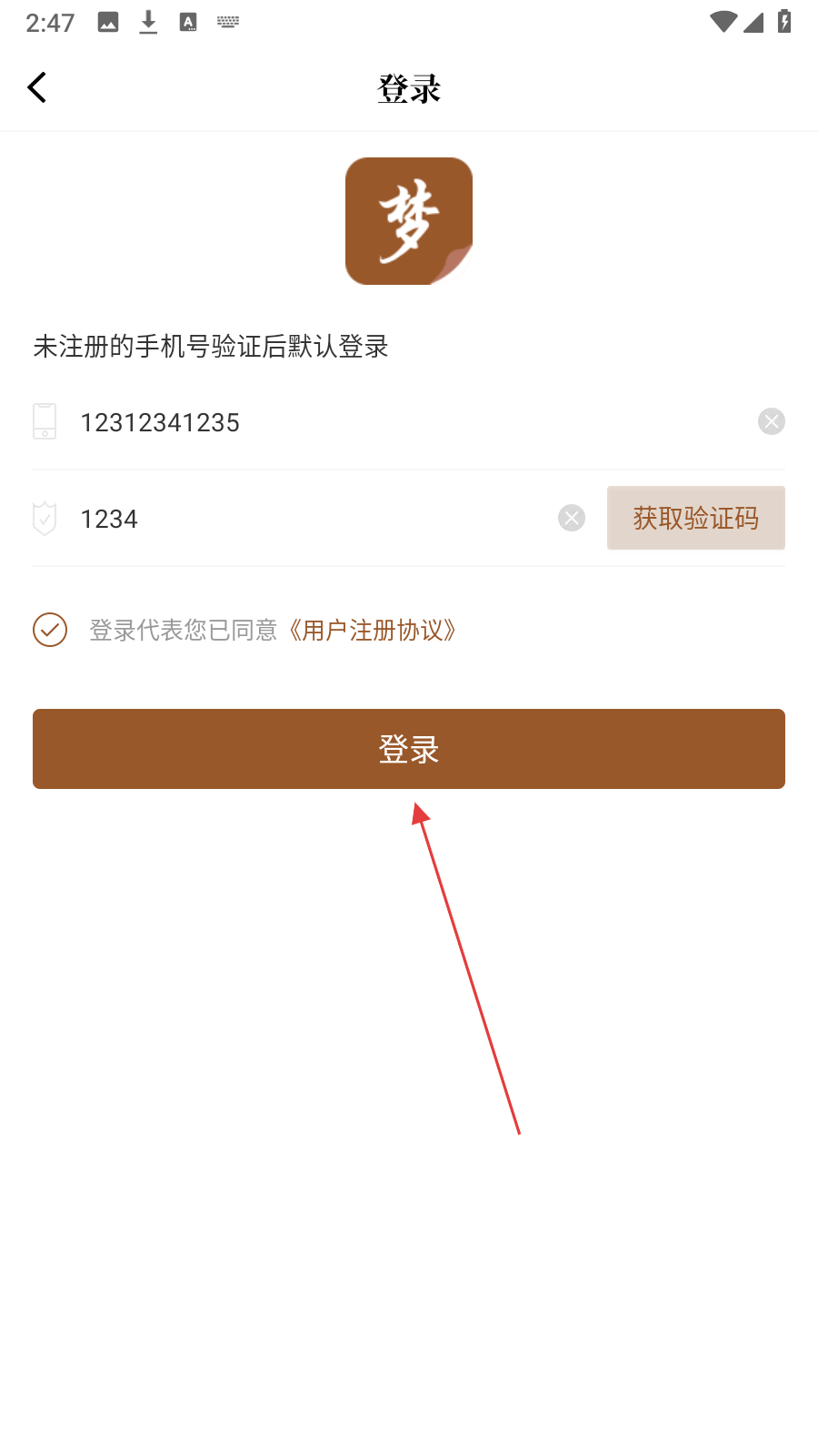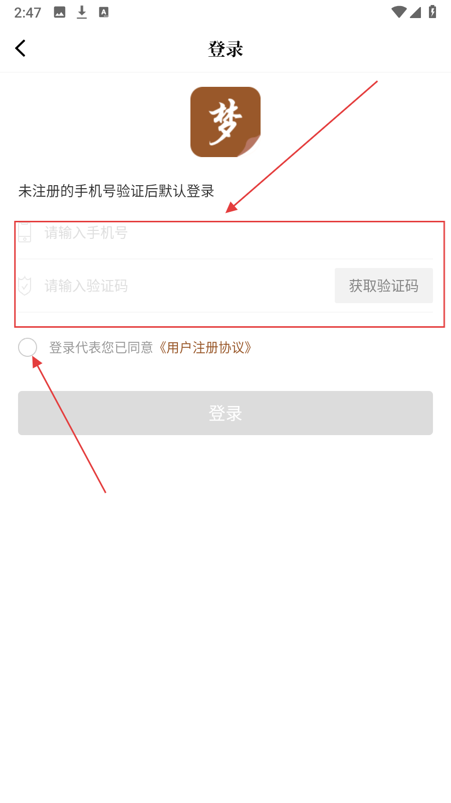 3、在登录页面,输入【手机号和验证码】,勾选【协议】。