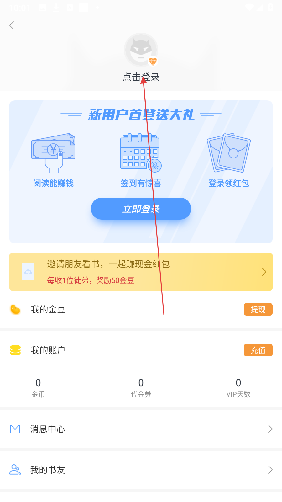 2、在个人页面,点击上方【点击登录】区域,进入账号登录选择页面。