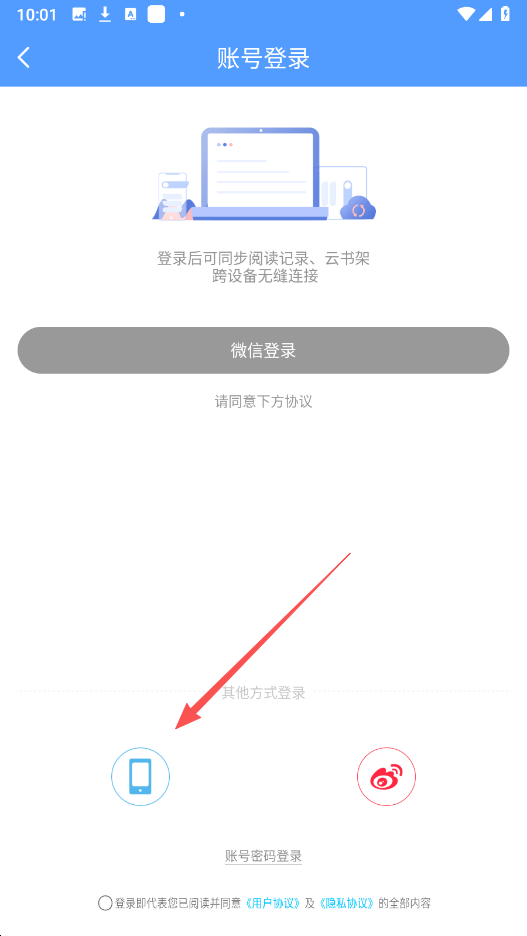3、在账号登录页面,点击其他方式登录里的【手机图标】,进入手机号登录页面。