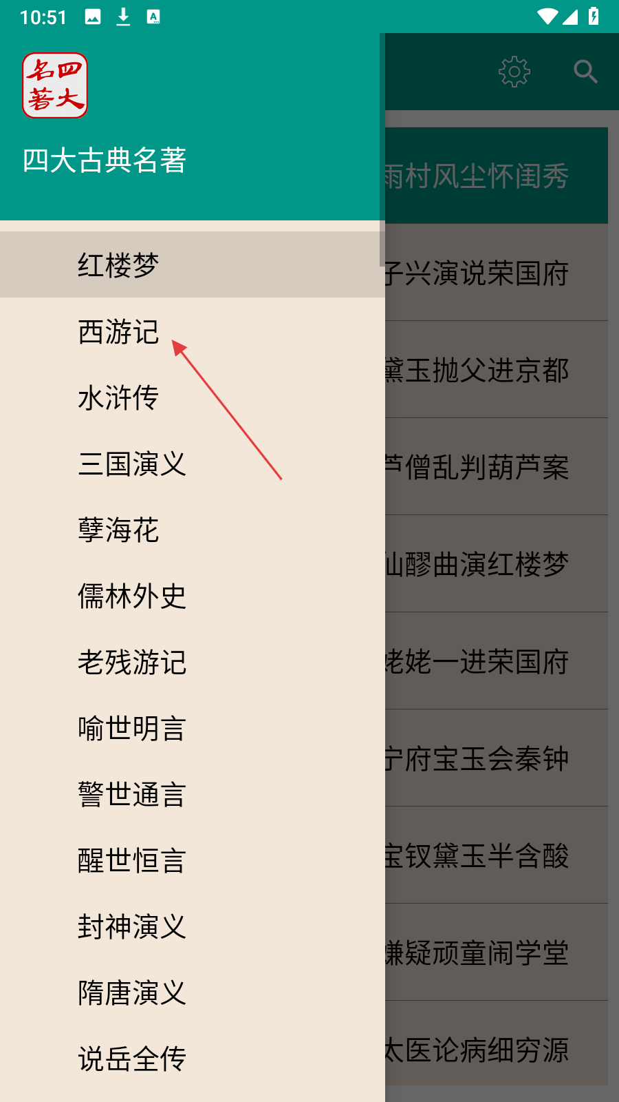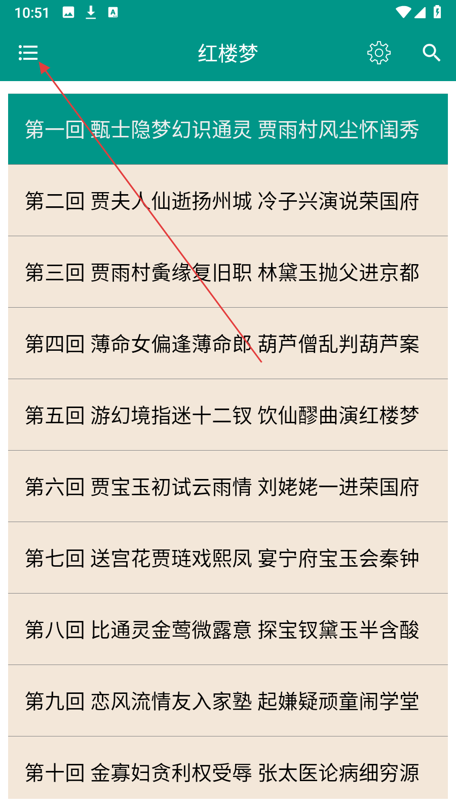 1、在《红楼梦》章节列表页面,点击【左上角菜单图标】,展开名著列表。