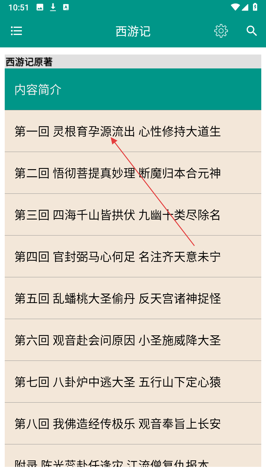 3、在《西游记》页面,点击【想要阅读的章节】,进入章节阅读页面。